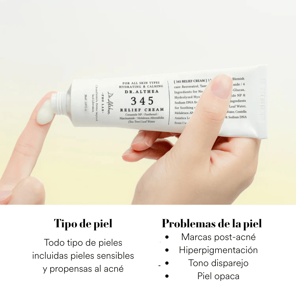 Dr. Althea 345 Relief actúa calmando la piel mientras hidrata y cuida las zonas con brotes, y su fórmula ligera ayuda a mantener la piel cómoda, sin grasa y a mejorar la apariencia del acné con el uso constante, sin causar irritación ni sensación pesada.