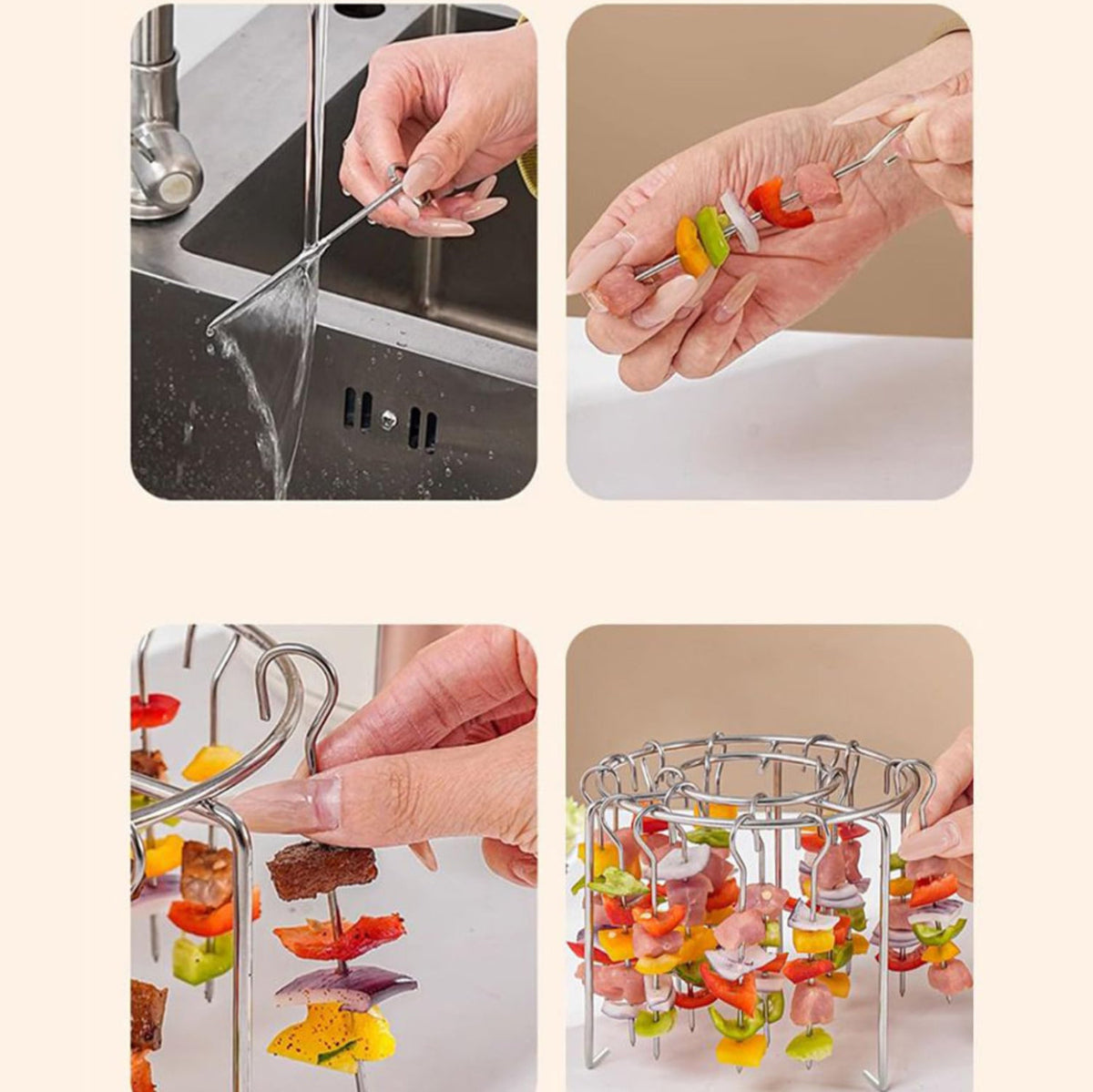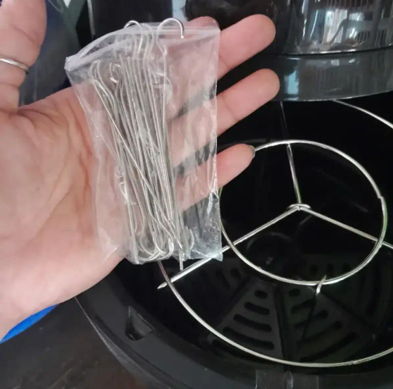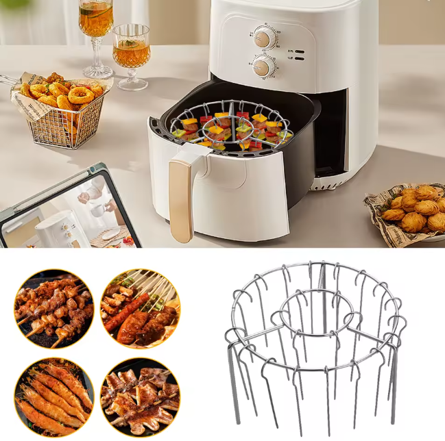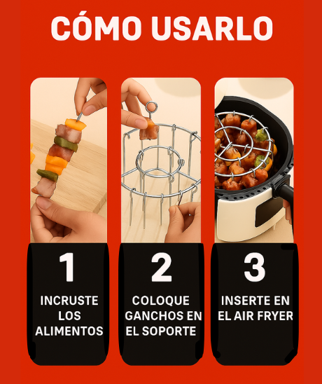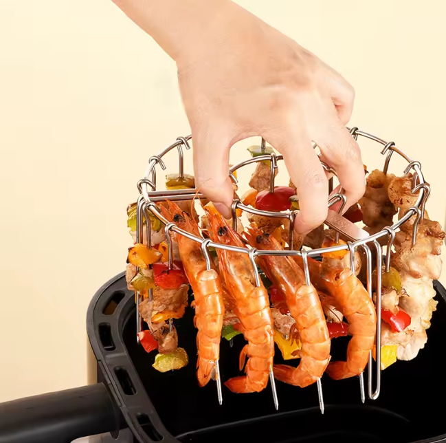 La Parrilla Para Airfryer está diseñada en acero inoxidable para ofrecerte una cocción uniforme de 360°. Su sistema de ganchos permite preparar varias brochetas a la vez, logrando comidas más ligeras gracias al goteo natural de grasa. Es compacta, resistente y convierte cualquier receta en una experiencia práctica, deliciosa y mucho más saludable.