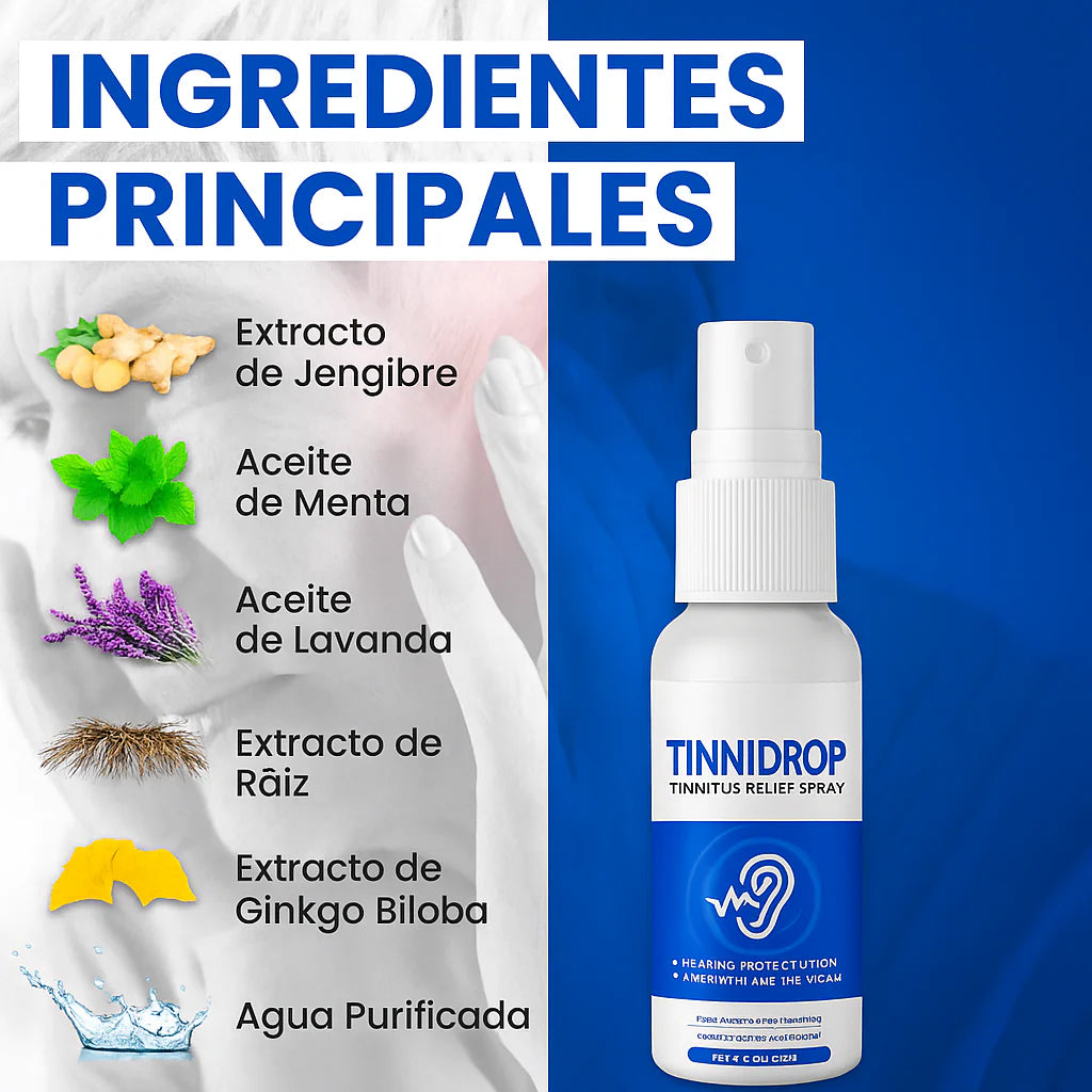 El Tinnidrop Spray Limpiador de Oído es la solución natural y efectiva que limpia profundamente, alivia la inflamación y mejora tu audición desde el primer uso. Con su fórmula 100% segura y libre de medicamentos, recupera el bienestar de tus oídos sin químicos agresivos ni dolor.